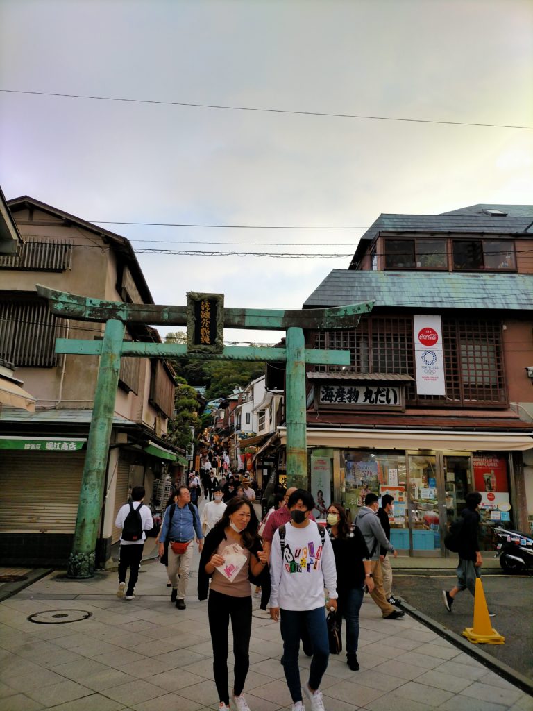 江の島の入口から続く江島神社までのレトロな商店街には、旅館や飲食店、土産物店などが立ち並びます。しらす、磯料理の他、饅頭やたこせんべいなども味わえ、多くの観光客がにぎわいを見せます。