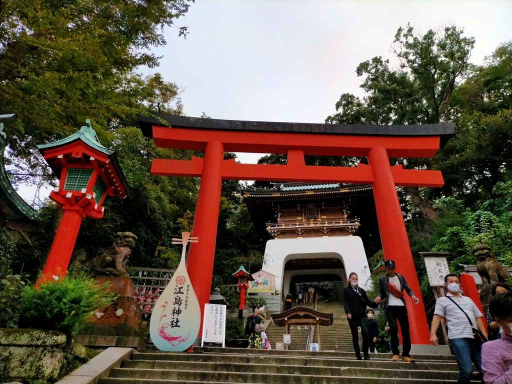 江の島の入口・弁天橋から弁財天仲見世通りを上った先にたどり着くのが、日本三大弁財天を祀る江島神社です。「辺津宮」「中津宮」「奥津宮」の3社からなっています。祀られている三女神は「海の神」「水の神」の他、幸福を招き、芸道上達の功徳を持つ神として仰がれています。福岡・宗像大社、広島・厳島神社と同じ神でもあります。鎌倉時代に仏師によって造られたとされる「木造弁才天坐像」は、頭上に蛇の体をした宇賀神をいただく「宇賀弁才天」が現存する中で最古で、2019年度に国の重要文化財に指定されました。